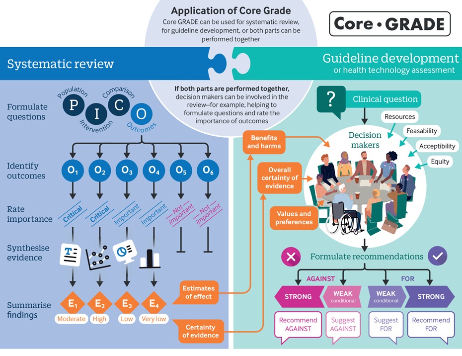 Este es el primer artículo de una serie que describe Core GRADE (Grading of Recommendations Assessment, Development and Evaluation), los fundamentos que los autores de revisiones sistemáticas, informes de evaluación de tecnologías sanitarias y guías de práctica clínica necesitan para utilizar el enfoque Core GRADE a fin de evaluar la certeza (calidad y confianza) de la evidencia y la solidez de las recomendaciones. Si bien la serie se centra en la evidencia que compara una sola intervención con un único comparador y adopta la perspectiva del paciente, los principios subyacentes también se aplican a la evidencia y las decisiones desde una perspectiva poblacional o de salud pública. BMJ, 22 de abril de 2025