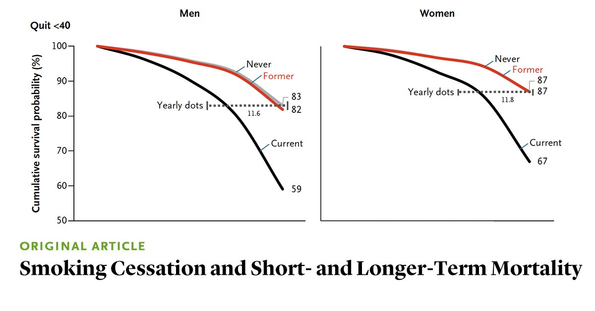 Dejar de fumar a cualquier edad, pero especialmente en los más jóvenes, se asoció con un menor exceso de mortalidad en general y por enfermedades vasculares, respiratorias y neoplásicas. Las asociaciones beneficiosas fueron evidentes ya 3 años después de dejar de fumar. NEJM Evid. 8 de febrero de 2024