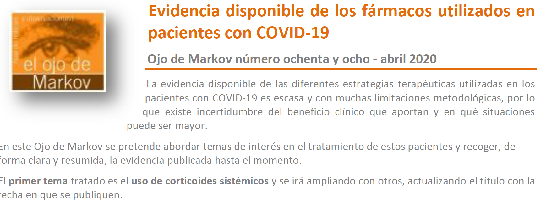 Ojo de Markov número ochenta y ocho - abril 2020 , 13 de abril de 2020La evidencia disponible de las diferentes estrategias terapéuticas utilizadas en los pacientes con COVID-19 es escasa y con muchas limitaciones metodológicas, por lo que existe incertidumbre del beneficio clínico que aportan y en qué situaciones puede ser mayor. En este Ojo de Markov se pretende abordar temas de interés en el tratamiento de estos pacientes y recoger, de forma clara y resumida, la evidencia publicada hasta el momento.