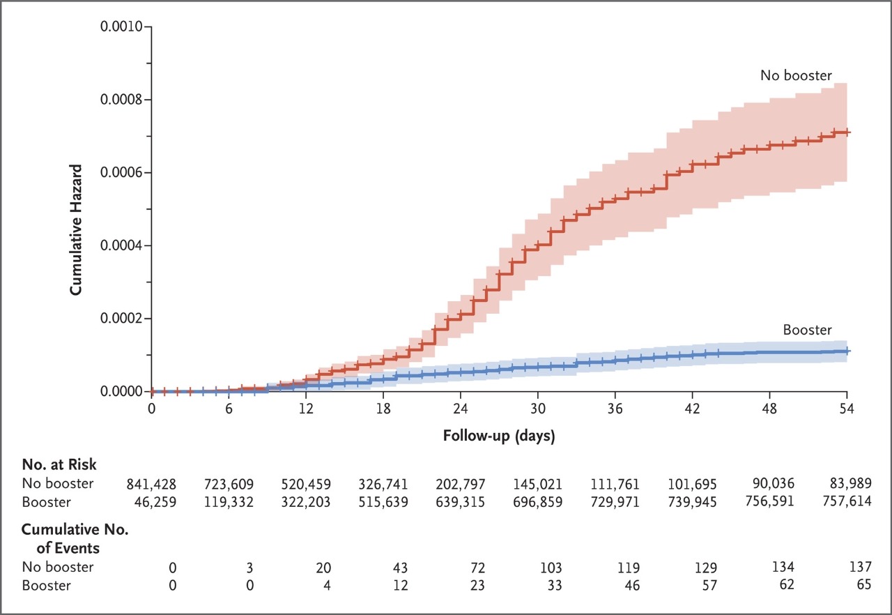 Los participantes que recibieron un refuerzo al menos 5 meses después de una segunda dosis de BNT162b2 (Pfizer-BioNTech) tuvieron un 90% menos de mortalidad debido a Covid-19 que los participantes que no recibieron un refuerzo. N Engl J Med. 8 de diciembre de 2021