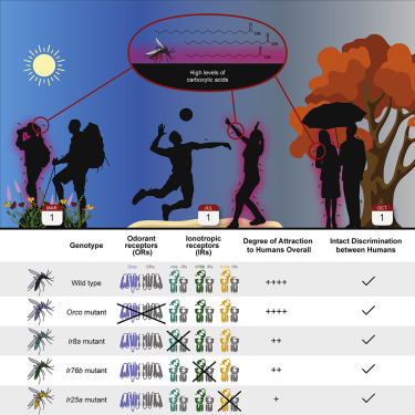 El vínculo entre los ácidos carboxílicos elevados en el olor de la piel humana "imán de mosquitos" y los fenotipos de mutaciones genéticas en los receptores de ácido carboxílico sugiere que dichos compuestos contribuyen a la atracción diferencial de los mosquitos. Cell. 27 de octubre de 2022