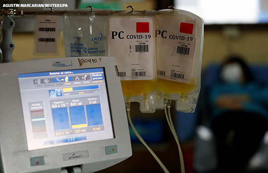En el ensayo PlasmAr, liderado por el Hospital Italiano de Buenos Aires y que incluyó a 12 centros públicos y privados de 6 provincias, no se observaron diferencias significativas en el estado clínico o la mortalidad general entre los pacientes tratados con plasma convaleciente y los que recibieron placebo. N Eng J Med. 24 de noviembre de 2020,