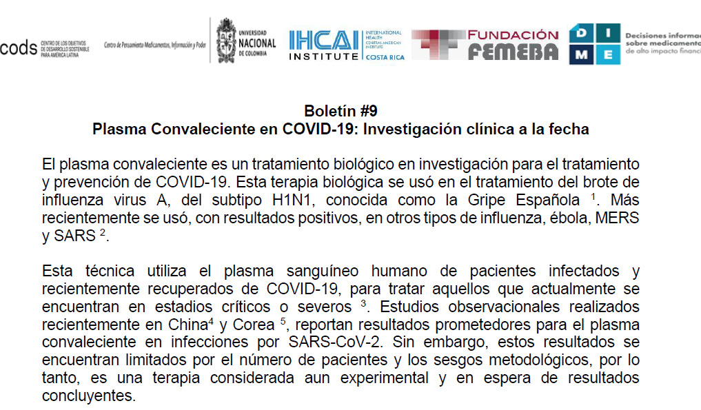 Plasma Convaleciente en COVID-19: Investigación clínica a la fecha