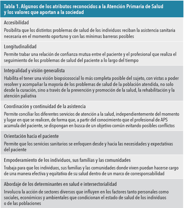 Los valores nucleares de la APS son: longitudinalidad, accesibilidad, integralidad y visión generalista, coordinación y continuidad asistencial, orientación al paciente, empoderamiento de pacientes, familias y comunidades, y abordaje de los determinantes en salud. La priorización de unos atributos respecto a otros es reflejo de la concepción que de la APS se tiene y de lo que se le exige.AMF , marzo 2021