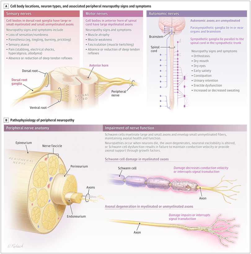 La neuropatía periférica afecta aproximadamente al 1% de los adultos en todo el mundo y puede causar síntomas sensitivos, motores y autonómicos. La diabetes es la causa más común de neuropatía periférica en los países occidentales. Los tratamientos de primera línea para el dolor neuropático incluyen gabapentina, pregabalina, duloxetina y amitriptilina. JAMA, 17 de noviembre de 2025
