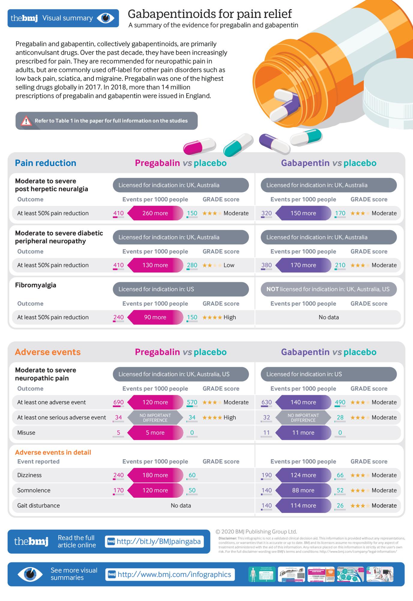 - La pregabalina y la gabapentina pueden ser eficaces como tratamiento deprimera línea para algunas personas con dolor neuropático, como la neuralgiaposherpética y la neuropatía periférica diabética. - No son efectivos para el dolor lumbar, la ciática, la estenosis espinalo la migraña episódica, y no se recomienda su uso fuera de etiqueta para estasafecciones - Se debe solicitar a los pacientes que informen sobre los efectossecundarios, como mareos, somnolencia y problemas de la marcha, que puedenrequerir que los medicamentos se reduzcan y se suspendan. BMJ 28 de abril de 2020