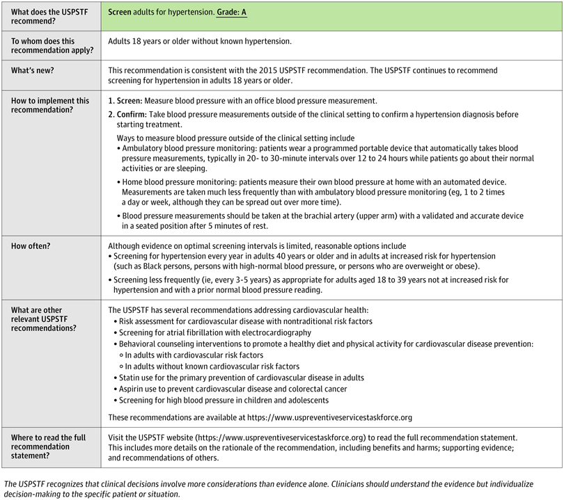 La USPSTF recomienda la detección de hipertensión en adultos mayores de 18 años con medición de la presión arterial en el consultorio. La USPSTF recomienda obtener mediciones de la presión arterial fuera del entorno clínico para confirmar el diagnóstico antes de comenzar el tratamiento. JAMA, 27 de abril de 2021