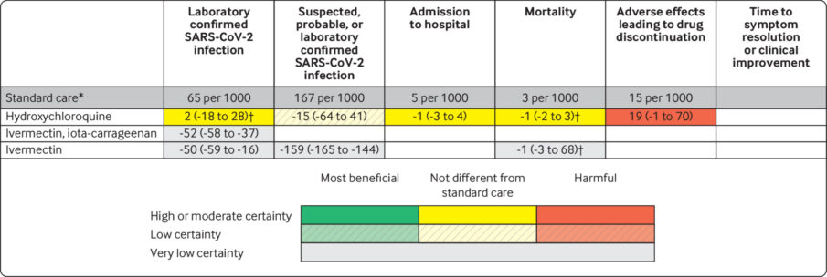 Una revisión sistemática no encuentra hasta el momento medicamentos eficaces para prevenir la infección: la mejor estudiada es la hidroxicloroquina, con un efecto trivial o nulo sobre las internaciones y la mortalidad, y con efectos adversos relevantes. Los estudios de ivermectina sola o acompañada por carragenano se evaluaron como de alto riesgo de sesgo y con gran imprecisión, de modo que su eficacia es todavía incierta. British Medical Journal, 26 de abril de 2021.