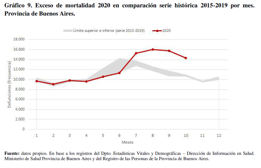 Se constata un exceso de 10% de la mortalidad total sobre los valores promedio de 2010-2019. Las muertes por COVID-19 en la provincia superan en casi un 50% este exceso de mortalidad, indicando que el coronavirus ha reemplazado parcialmente otras causas de muerte, y que no hay un subregistro de muertes por COVID. Margen, diciembre de 2020.