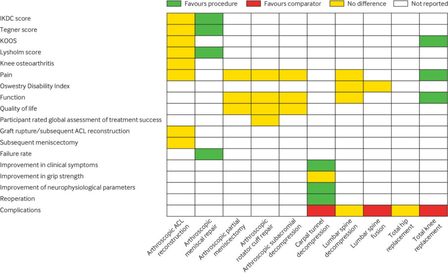 Aunque pueden ser efectivos en general o en ciertos subgrupos, no hay una base de evidencia sólida y de alta calidad que muestre que muchos procedimientos ortopédicos electivos que se realizan con frecuencia son más efectivos que las alternativas no quirúrgicas. A pesar de la falta de pruebas sólidas, las directrices nacionales todavía recomiendan algunos de estos procedimientos en determinadas situaciones. BMJ, 8 de julio de 2021