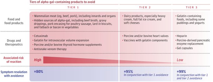Las alergias alimentarias mediadas por IgE, incluidas las respuestas alérgicas retardadas mediadas por IgE a la carne roja en el síndrome alfa-gal, son comunes en los EE. UU. y pueden causar anafilaxia y, en raras ocasiones, la muerte. La anafilaxia alimentaria mediada por IgE requiere tratamiento inmediato con inyección de epinefrina. Tanto la alergia a las proteínas alimentarias como el tratamiento del síndrome alfa-gal requieren evitar los alimentos alergénicos, mientras que el síndrome alfa-gal también requiere evitar las picaduras de garrapatas. JAMA. 13 de febrero de 2024