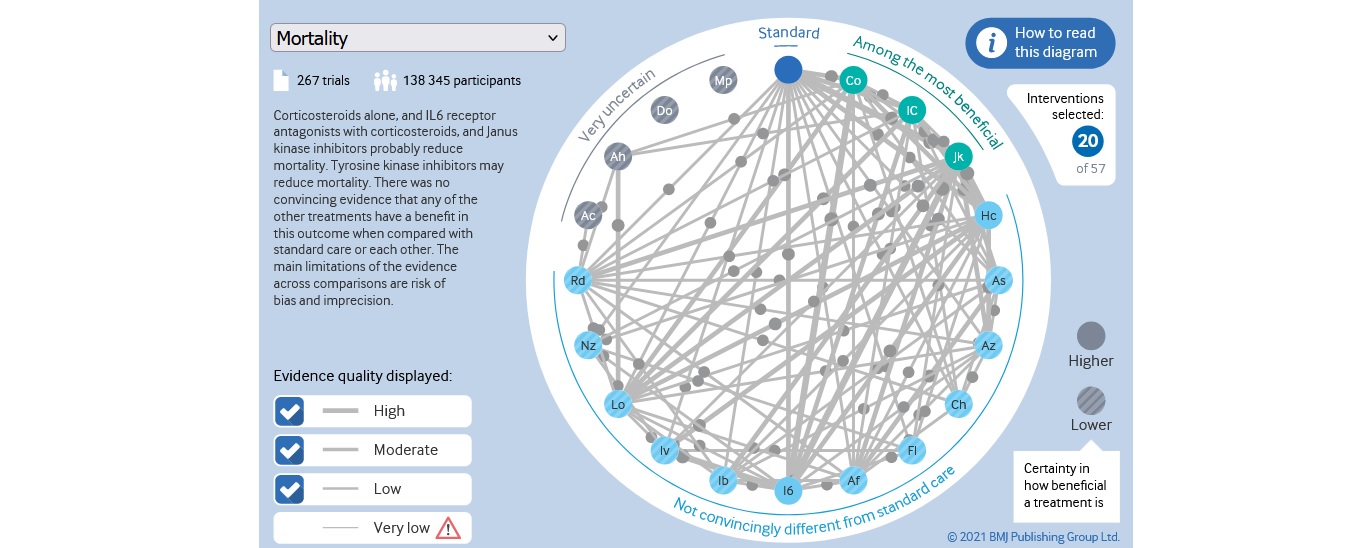 La herramienta interactiva en línea de esta revisión sistemática, que acaba de publicar su quinta actualización, permite explorar de modo rápido la eficacia de una variedad de terapias investigadas para el COVID-19. British Medical Journal, 12 de julio de 2022.