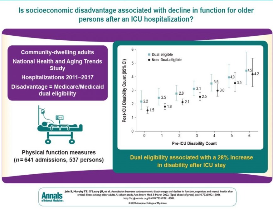 Las personas mayores con desventaja socioeconómica corren un mayor riesgo de deterioro de la función y la cognición después de una hospitalización en la unidad de cuidados intensivos, respecto del resto. Este hallazgo destaca la necesidad de priorizar a las personas mayores de bajos ingresos en los esfuerzos de rehabilitación y recuperación tras una enfermedad crítica y justifica la investigación de los factores que conducen a esta disparidad.Ann Intern Med, 8 de marzo de 2022