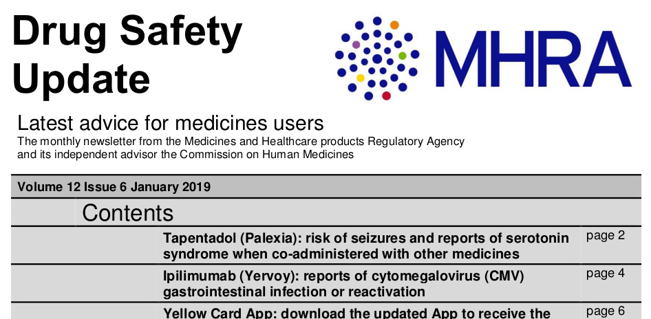 MHRA, 9 de enero de 2019 Tapentadol: riesgo de convulsiones, síndrome de serotonina Ipilimumab : reactivación o infección gastrointestinal por citomegalovirus (CMV)