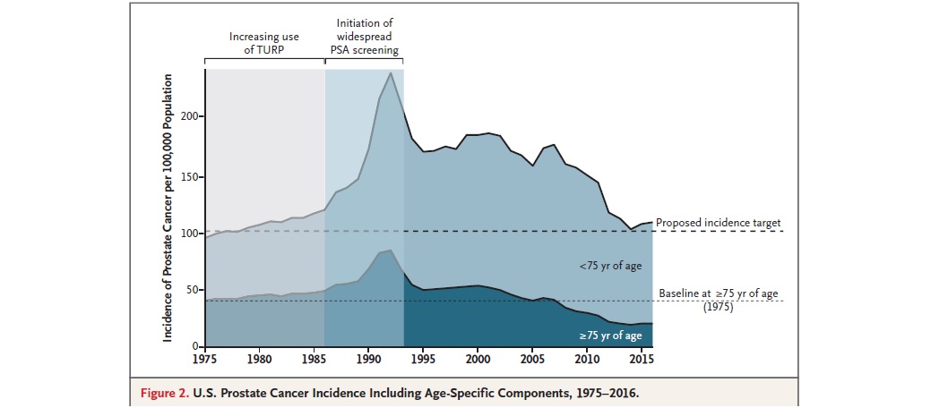 La evolución del cáncer de próstata en EEUU sugiere que el principal efecto del rastreo con PSA ha sido el sobrediagnóstico de tumores de buena evolución, y que cualquier beneficio de la detección precoz del cáncer agresivo queda compensado por el deterioro de calidad de vida por los procedimientos diagnósticos y terapéuticos. New England Journal of Medicine, 16 de abril de 2020.