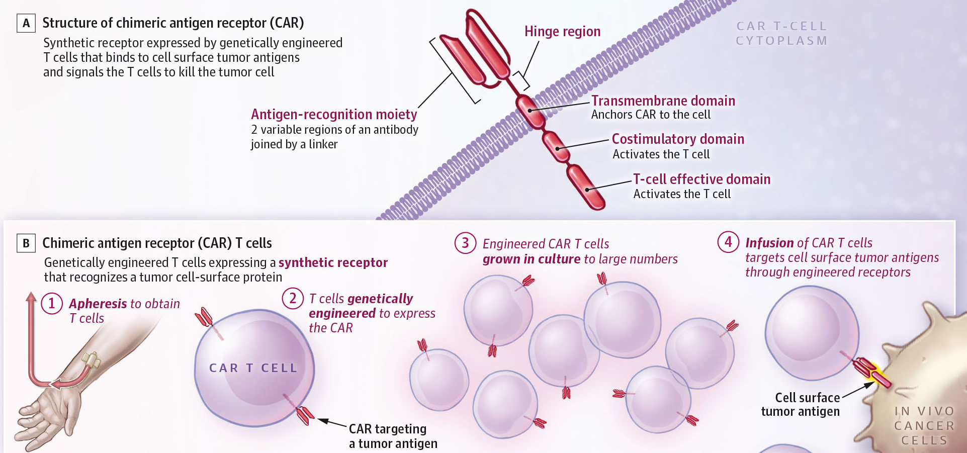 La terapia con células T CAR es una terapia aprobada por la FDA que ha mejorado la supervivencia libre de progresión para el mieloma múltiple, la supervivencia general para el linfoma de células B grandes y ha logrado altas tasas de remisión del cáncer para otras neoplasias hematológicas, como la leucemia linfoblástica aguda, el linfoma folicular y el linfoma de células del manto. Las terapias basadas en linfocitos T aprobadas recientemente demostraron el potencial para mejorar los resultados en las neoplasias malignas de tumores sólidos. Se revisan aquí el mecanismo, eficacia y efectos adversos de su uso. JAMA, noviembre de 2024.