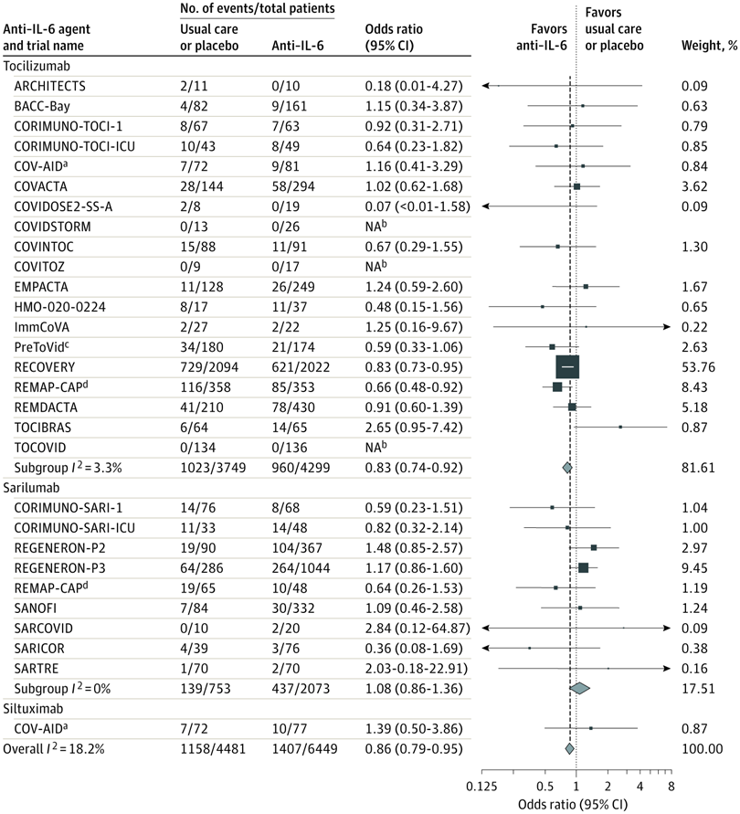 En este metanálisis prospectivo de ensayos clínicos de pacientes hospitalizados por COVID-19, la administración de antagonistas de IL-6, en comparación con la atención habitual o placebo, se asoció con una menor mortalidad por todas las causas a los 28 días. JAMA, 6 de julio de 2021.