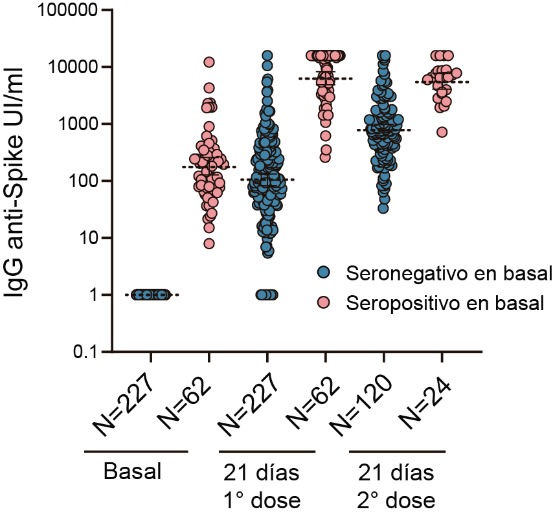 El trabajo mostró que el 94% de las personas que recibieron una sola dosis y el 100% con dos dosis de la vacuna producen anticuerpos específicos. Además las personas previamente infectadas que recibieron solo una dosis producen cinco veces más anticuerpos que quienes completaron el esquema de dos dosis sin antecedente de COVID-19. Ministerio de Salud de la Provincia de Buenos Aires, Ministerio de Ciencia, Tecnología e Innovación,-Instituto Leloir‐ CONICET‐INBIRS‐UNLP. 13 de Abril de 2021