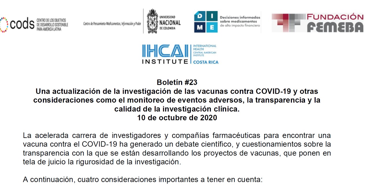 Vacunas contra COVID-19: actualización de la investigación de las y otras consideraciones como el monitoreo de eventos adversos, la transparencia y la calidad de la investigación clínica.