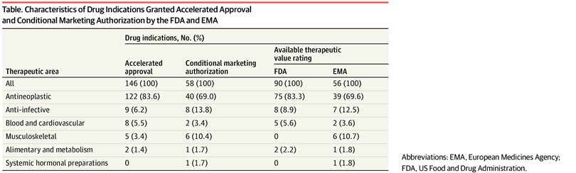 En este estudio de cohortes, entre las nuevas indicaciones de medicamentos aprobadas a través de las vías de aprobación acelerada o autorización de comercialización condicional en los EE. UU. y Europa de 2007 a 2021, el 38,9 % y el 37,5 %, respectivamente, demostraron un alto valor terapéutico. Una proporción sustancialmente menor de indicaciones de cáncer que de indicaciones no oncológicas fueron calificadas como de alto valor terapéutico. Los encargados de formular políticas y los reguladores deben aumentar la aplicación de la finalización oportuna del estudio posterior a la aprobación para los medicamentos que califican para estas vías. JAMA Health Forum. 19 de agosto de 2022