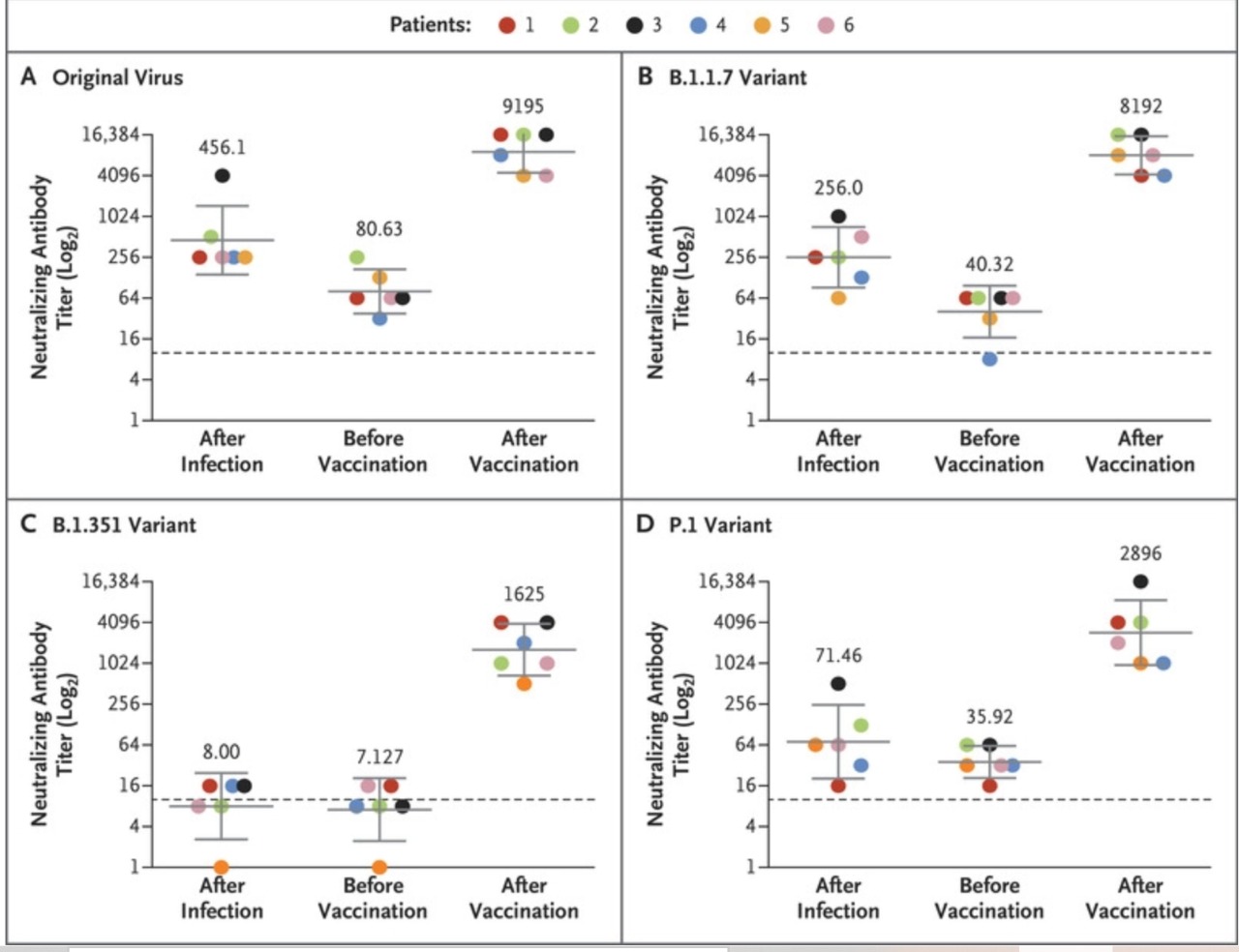 Este estudio mostró que, en nuestra pequeña cohorte, una dosis de vacuna aumentó sustancialmente la actividad neutralizante contra todas las variantes probadas, con títulos similares detectados en pacientes para cada variante. Esto resalta la importancia de la vacunación incluso en pacientes previamente infectados, dado el beneficio adicional de una mayor respuesta de anticuerpos a las variantes probadas. N Engl J Med,7 de abril de 2021